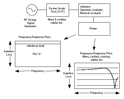The "Swept Frequency Response Test Setup" page is included to help understand the principle by which most RF measurements and alignments are made, especially those for filters and duplexers. Operation is straight forward, an RF (Radio Frequency) signal from as signal generator is observed on an indicator, usually a spectrum analyzer or network analyzer. "DUT"s (Devices Under Test) are merely inserted between the generator and the indicator and the DUT is tuned to obtain the desired response which is then plotted. Plots are usually measured in dB (decibels) for loss or gain and frequency is measured in MegaHertz (MHz). These plots are used to indicate the performance of a device so comparisons and differences can be easily recognized. This helps to determine solutions to problems. The more you know about your system the better able you are to solve problems that may arise, especially interference problems. By correctly configuring or designing your system you can virtually eliminate all interference problems. The following discussion will tell you why and how.